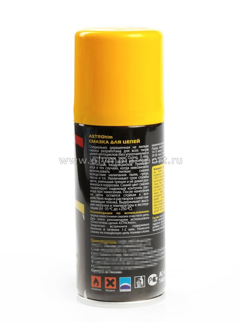 Специально окрашенная не липкая синтетическая смазка разработана для всех типов цепей мотоциклов (без уплотнителей и с уплотнителями типа О-ring, X-ring, Z-ring), а также цепей картов и велосипедов.